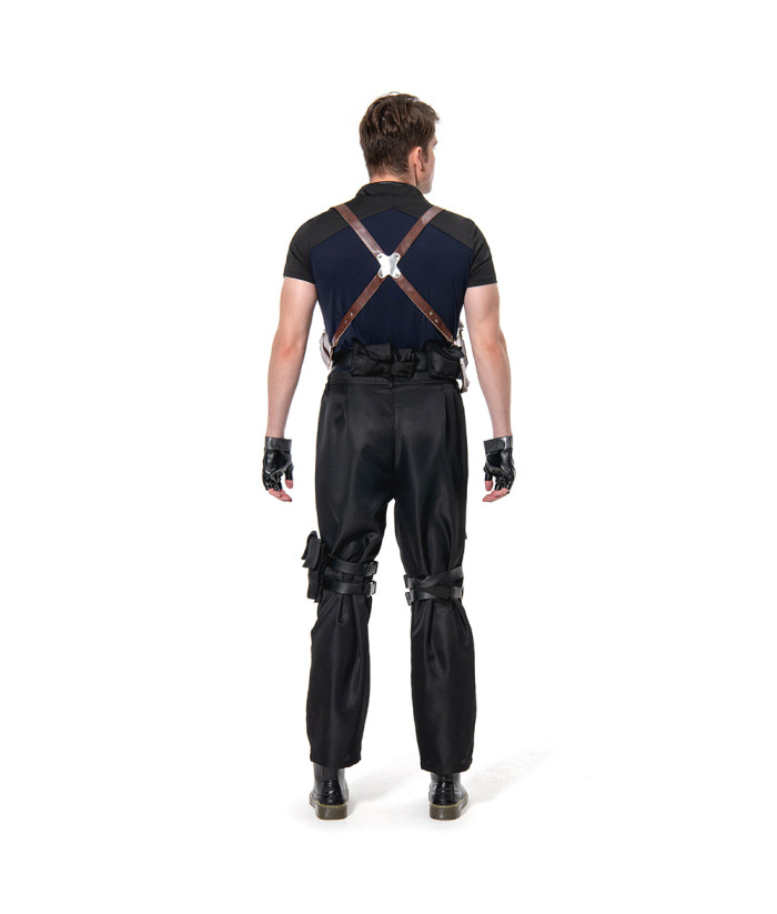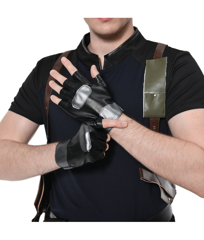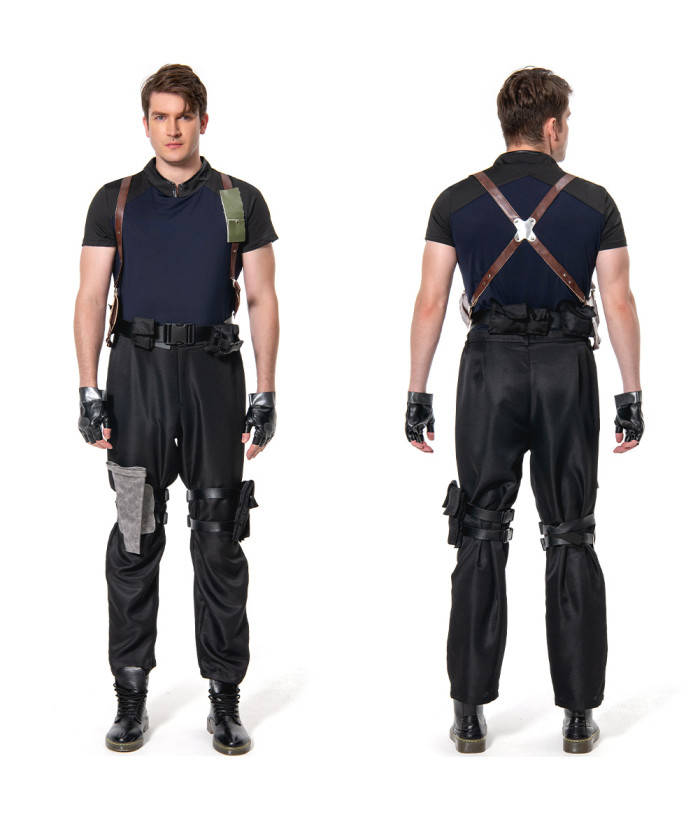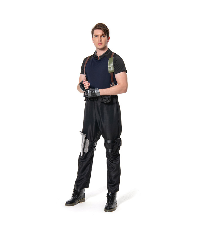 Men Black Tactical Suit Tight Top with Leather Strap Gun Pouch Halloween Costume