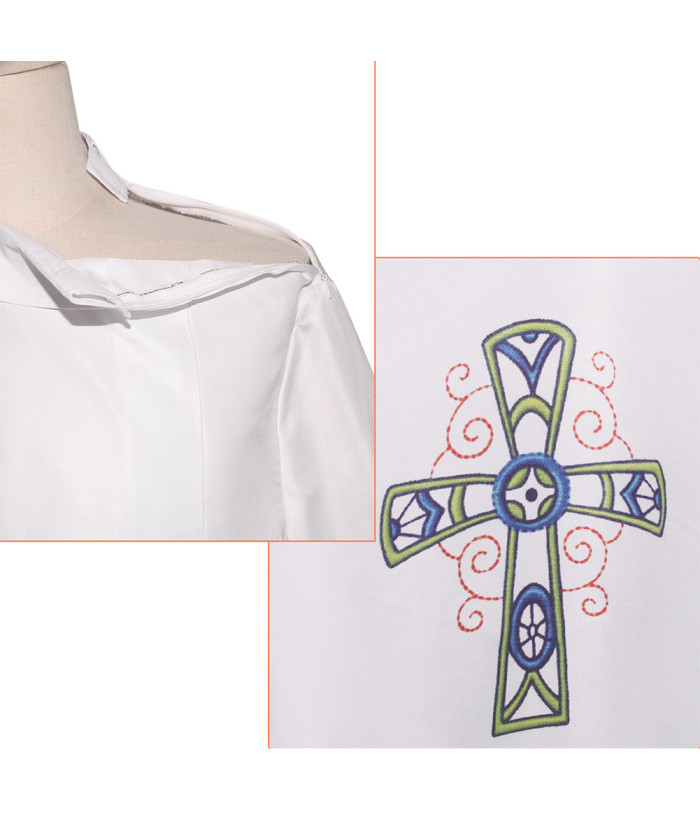 Men Blue Lace Cross Print Baptism Choir White Robe Halloween Cosplay Costume.Best choice for Comic-con, Halloween, Carnival, Christmas and other parties