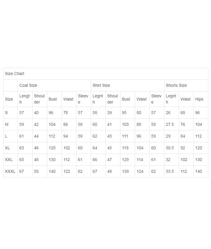 | Including | Outerwear + Jacket + Shirt + Shorts + Bow Tie + Socks |