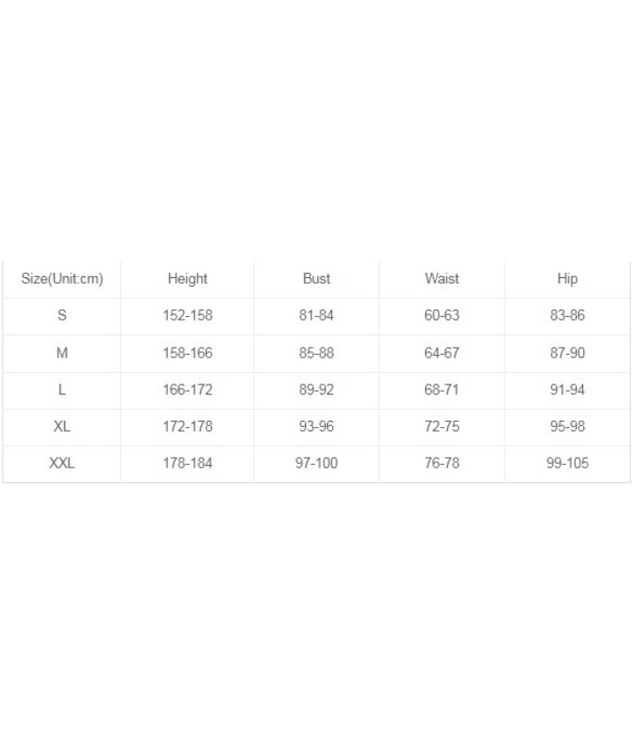 | Size(Unit:cm) | Height | Bust | Waist | Hip |